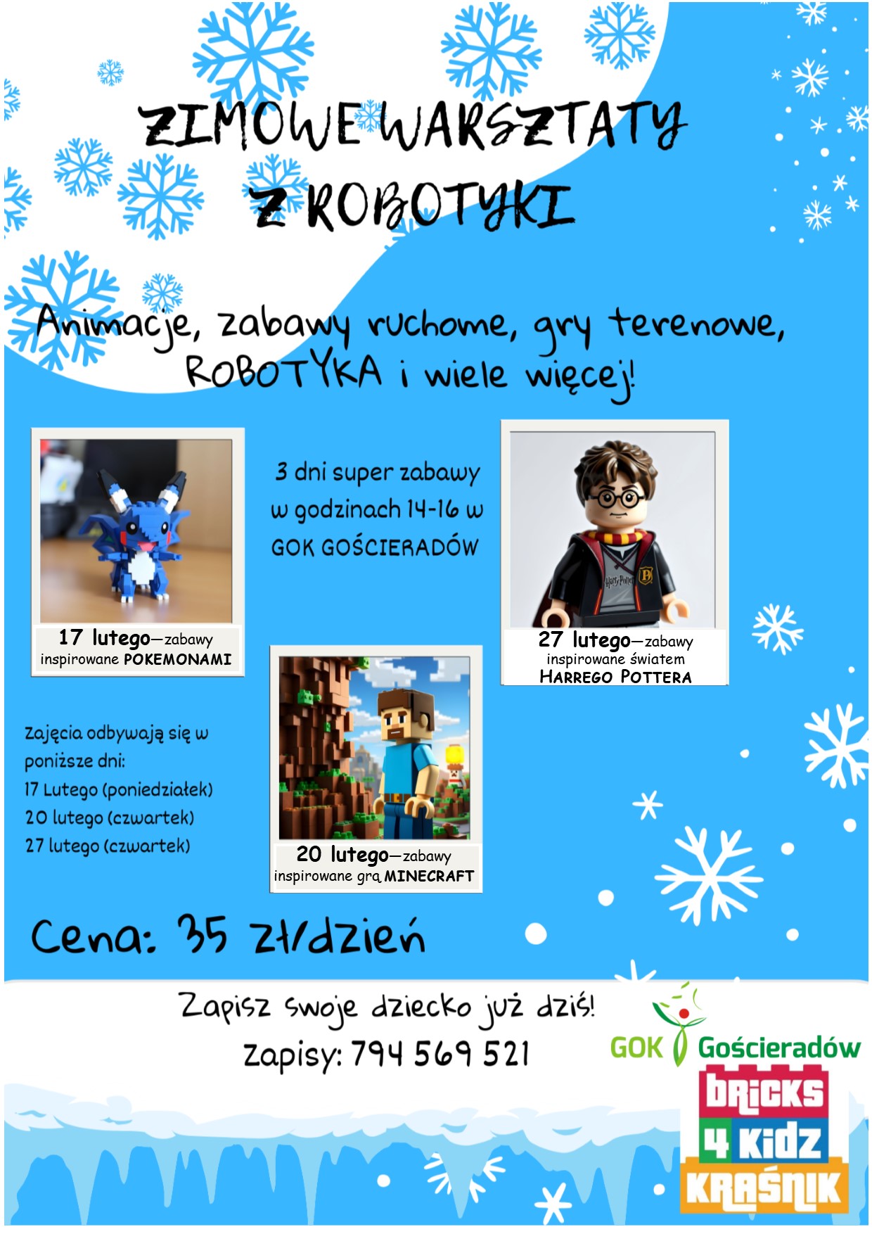- Poniedziałek: zimowe warsztaty z Robotyki prowadzone przez Bricks4Kidz w godz. 14 - 16, potem zajęcia pllastyczne